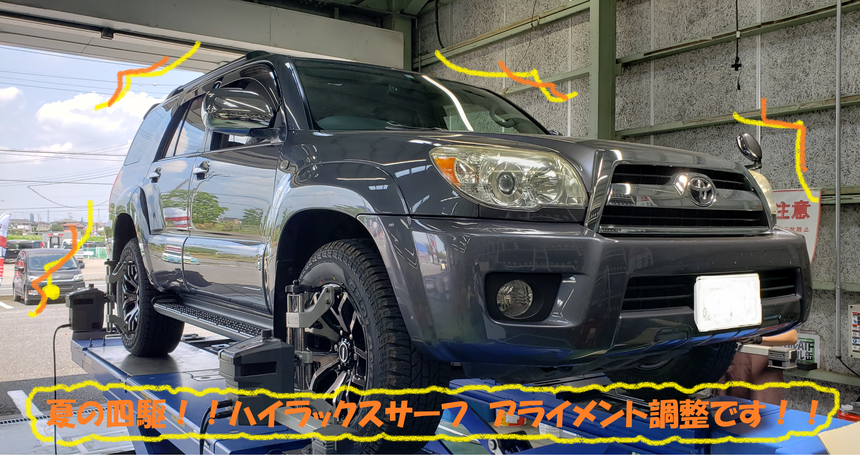 トヨタ ハイラックスサーフ 215系 アライメント調整作業です トヨタ ハイラックス サーフ 総和店こだわり作業 タイヤ館 総和 茨城県のタイヤ カー用品ショップ タイヤからはじまる トータルカーメンテナンス タイヤ館グループ